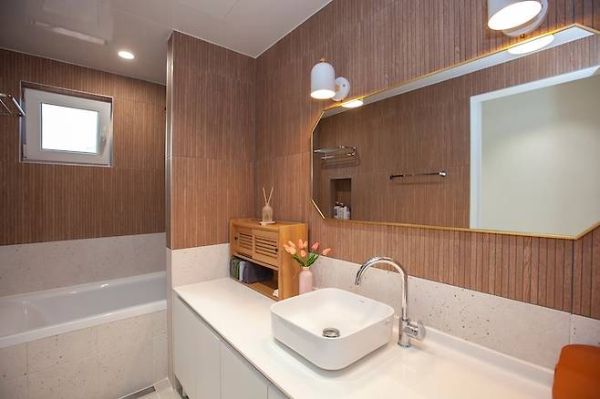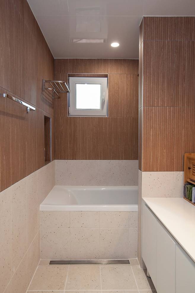 이 곳은 욕실입니다. 위쪽은 우드 타일, 아래쪽은 테라조 타일을 선택해서 톤 다운 되면서도 따뜻한 느낌의 욕실을 원했어요. 우드 타일은 일찍이 찜 해놓고 꼭 욕실은 우드 타일로 해달라고 부탁 드려 이렇게 완성되었습니다.