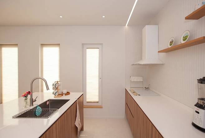 그리고 상부장을 달지 않고 원목 선반을 달아 공간감을 유지하면서 허전하지 않게 선택했습니다. 주방은 마지막까지 고민이 많았고 변경을 많이 했던 공간이었는데, 결론적으로는 상부장 없이 대면형 주방으로 선택한 것에 굉장히 만족합니다.
