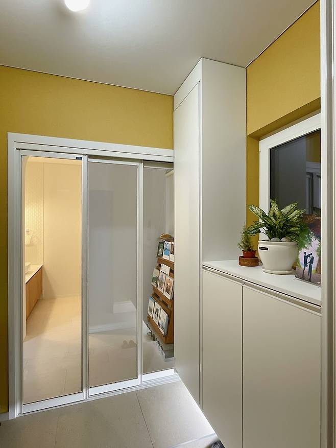 창호는 모두 독일식 창호이고 살라만더 제품입니다. 가장 신경을 많이 쓴 부분이 단열이어서 많은 고민하지 않고 바로 살라만더를 선택했습니다. 저 노랑 벽지는 정말 정말 고민을 많이 했는데, 우드 톤의 현관문과 잘 어우러져서 따뜻한 느낌을 줍니다. 식물하고도 잘 어울려요.