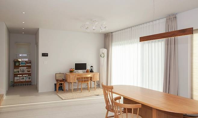 거실과 주방의 경계가 뚜렷하지 않아서 대면형 주방을 선택하였고, TV와 소파가 없는 거실이다보니 큰 식탁을 두어 주방과 거실이 연결되는 동선입니다. 아이가 책을 읽거나 숙제를 할 때 주방 일을 하면서 같이 있다는 안정감을 줄 수 있다는 점이 가장 큰 장점입니다.