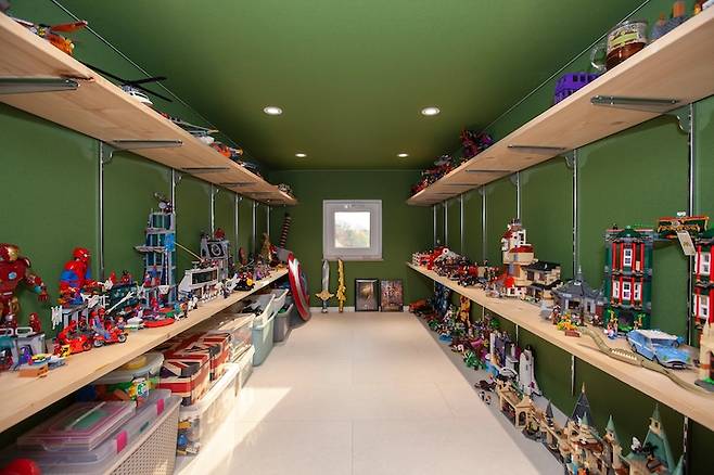 레고들은 정말 엄청 많습니다. 맨 위 선반까지 양옆으로 꽉꽉 차있어요. 숙제를 하고 나서는 이 공간에서 레고 피규어들을 가지고 재미있게 놀거나, 남은 레고 부품을 모아놓은 것들로 다른 것들을 만들며 시간을 보냅니다. 아이가 제일 좋아하는 공간이 될 수 밖에 없지요.