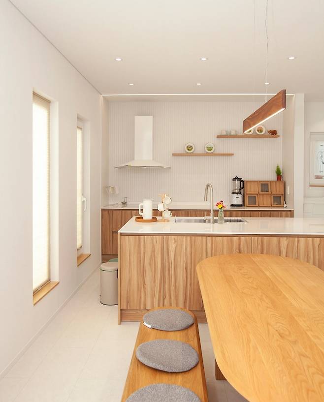 저는 주택에 살기 전부터 아파트에서도 방향과 채광을 정말 중요하게 생각했었어요. 다행히 집을 짓는 땅의 모양과 전체적인 방향이 남향이라 집 자체도 그렇게 되었답니다. 그래서 거실의 창을 아주 크게 내었고, 주방은 세로로 긴 창을 규칙적으로 배열해서 프라이버시는 최대한 지키면서 채광도 고려하였고, 거실에서 바라보는 마당의 연속성도 생각했어요.