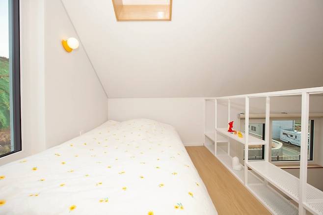 아이방에 있는 계단을 올라서면 보이는 공간입니다. 슈퍼 싱글 사이즈의 매트리스를 두고도 공간이 매우 많이 남아 실제로는 굉장히 넓게 느껴진답니다. 그리고 천창도 있어서 밤엔 달빛이 은은하게 듭니다. 그래서 침대 옆 수면등도 반달과 보름달이 연상되는 노란 조명을 선택했습니다.