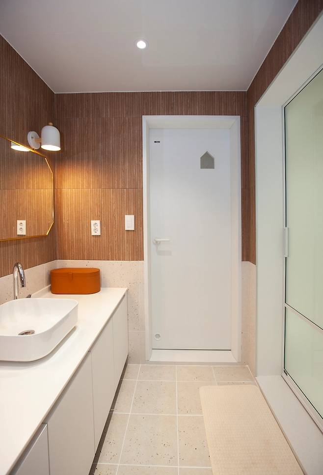 그리고 건식 세면대 반대편으로는 귀여운 집 모양의 무늬가 있는 문이 있는데, 여긴 변기만 둔 변기실입니다. 1층은 대부분 손님용으로 욕실을 사용할 것을 생각하여 샤워실은 두지 않았고, 최대한 거실과 주방이 넓어 보여야 했기에 이렇게 설계하였습니다.