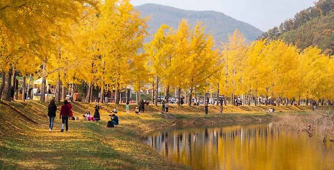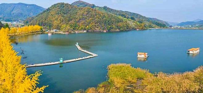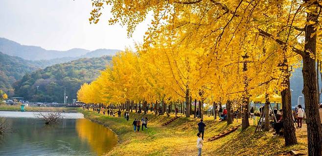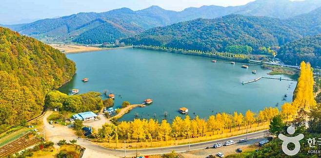 숲이 우거진 산자락 아래에 자리해 전경이 아름답고, 고요한 수면 위로 반사된 은행나무 줄이 만들어내는 풍경은 그야말로 영화 속 한 장면처럼 서정적입니다.