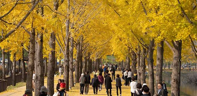 가장 아름다운 시기는 10월 하순부터 11월 초 사이입니다. 이 시기에는 은행잎이 완전히 물들어 길 전체가 황금빛 터널처럼 변해요. 길을 따라 천천히 걸으면 바스락거리는 낙엽 소리와 잔잔한 물소리가 어우러져 마음까지 차분해집니다.