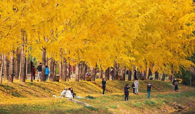 저수지를 따라 약 2km에 걸쳐 300여 그루의 은행나무가 늘어서 있어, 그 풍경만으로도 발길을 멈추게 하는 곳이죠.