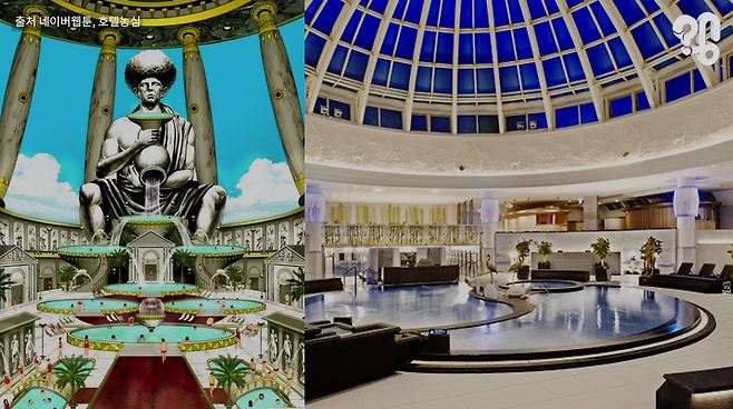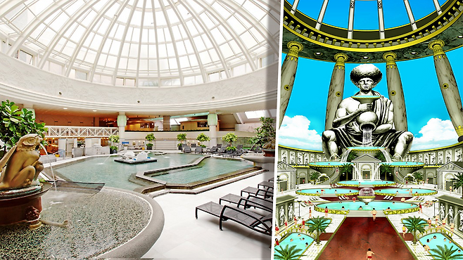 그럼 도입부에서 본 ‘철학탕’처럼 희한한 디자인은 어디서 나온 걸까. 허심청은 건축 당시 롯데월드, 롯데타워, 롯데호텔 등을 설계한 일본의 거물 건축가 오쿠노 쇼를 초청해 내부를 설계했다. 그러니까 지금 우리가 보는 허심청의 어마어마한 시설은 90년대의 독특한 감성과 일본식 호화 온천 디자인이 결합된 것이라고 할 수 있다.
