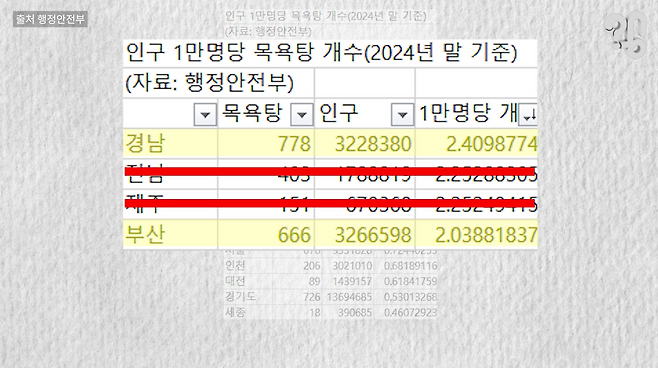 이런 목욕탕이 생긴 건 부산 자체가 목욕에 진심인 ‘목욕탕 도시’라는 점과 관련있다. 전국 광역지자체 중 면적 대비 인구가 적은 전남·제주를 빼면 부산·경남, 즉 PK 지역은 인구 대비 목욕탕이 가장 많다.