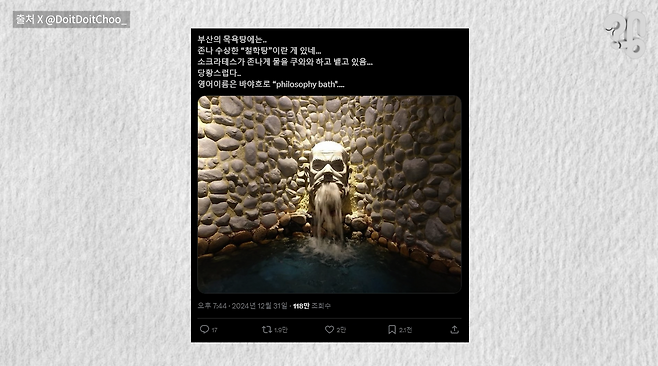 이 사진을 보라. 최근 X에서 화제였던 욕탕인데, 수염 난 남자 머리 석상에서 물이 콸콸 쏟아져 나오고 있다. 부산의 한 목욕탕에 있다는 이 욕탕의 이름은 자그마치 철학탕.