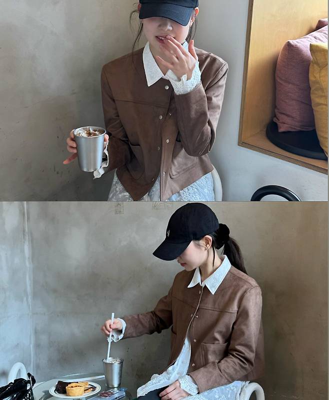 스웨이드 소재의 브라운 재킷이 룩의 중심을 잡아주고, 안쪽에 매치한 화이트 레이스 셔츠가 은은하게 포인트가 되어줘요.