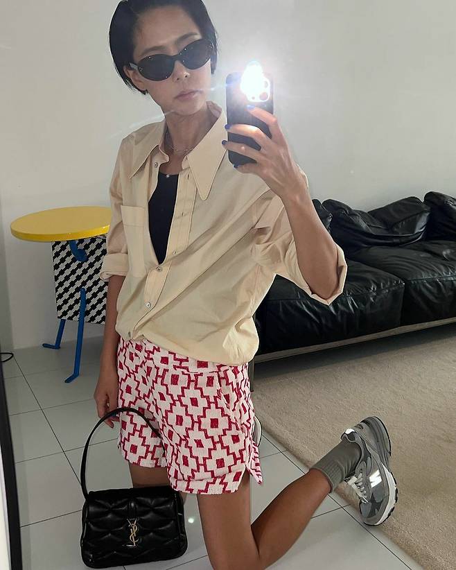 미드센추리 모던 인테리어의 정수를 보여주는 김나영의 선택은 현대 건축의 아버지 르 꼬르뷔지에가 디자인한 LC3 소파다. 스티브 잡스가 사랑한 소파로도 유명한 이 제품은 사용하면 자연스러운 주름이 더해져 시간이 흐를수록 더욱 멋스러워진다. 옆에 둔 건 멤피스의 크리스탈 사이드 테이블. 기하학적인 조형미가 돋보이는 프레임이 멋스럽다. 비비드한 옐로우, 블루 컬러와 흑백의 그래픽 패턴으로 인테리어 포인트 역할 또한 톡톡히 하는 제품. 전체적으로 스틸과 가죽, 플라스틱 소재의 매치와 비비드한 컬러 포인트로 생동감이 느껴진다.