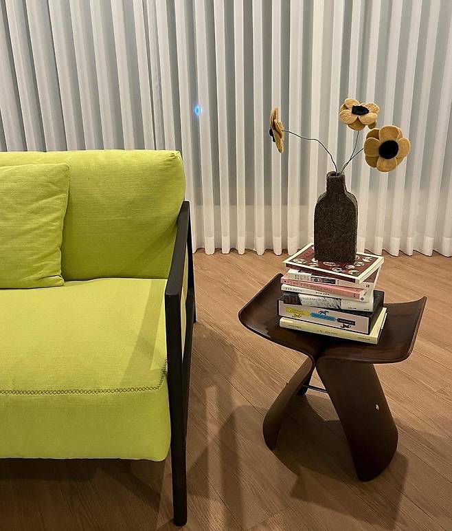 독립한지 얼마 되지 않은 효민은 집 꾸미기에 여념이 없다. 그런 효민이 심혈을 기울여 거실에 들여놓은 가구는 이탈리아 가구 브랜드 데파도바와 영국의 패션 디자이너 폴 스미스가 협업해 출시한 에브리데이 라이프 컬렉션의 라운지체어. 데파도바의 절제된 디자인에 상큼한 라임 그린 컬러가 더해져 스타일리시해 보인다. 옆에 보이는 건 비트라의 버터플라이 스툴. 효민은 스툴 위 평소 읽는 책을 올려 두고 테이블처럼 활용한다. 회화와 건축을 전공한 야나기 소라의 작품으로 나비 날개를 연상시키는 유려한 곡선 디자인이 특징. 직선적 요소가 돋보이는 소파 옆에 버터플라이 스툴을 두어 공간에 부드러움을 더했다.