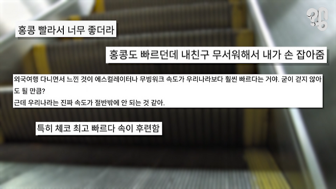 이 사진을 보라. 해외 나가서 지하철 타본 후기인데 대부분 외국과는 다르게 우리나라 지하철 에스컬레이터 속도가 느리다는 반응이 많다. 유튜브 댓글로 “지하철 에스컬레이터 속도가 외국보다 왜 느린지 알아봐달라”는 의뢰가 여러번 들어와 취재해봤다.