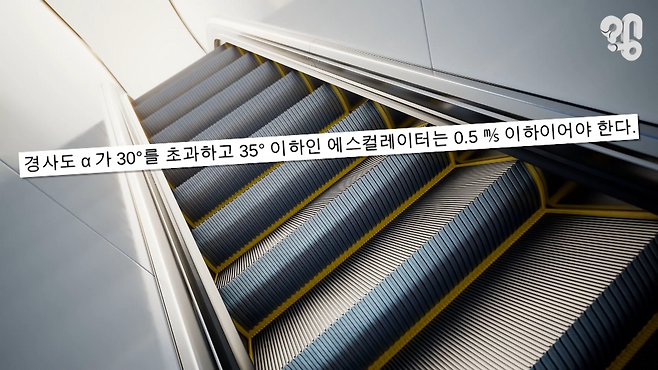 ‘에스컬레이터 설치에 대한 안전 표준’을 보면, 설치기준을 세세하게 규정하고 있는데 경사도 30도 이하 이게 우리가 이용하는 에스컬레이터인데 초당 0.75m/s(분당 약 45m)까지 속도를 낼 수 있다고 돼 있다. 예외적으로 설치 높이가 6m 이하고, 속도가 초당 0.5m/s 이하인 에스컬레이터는 경사도를 35도까지 올릴 수도 있다.