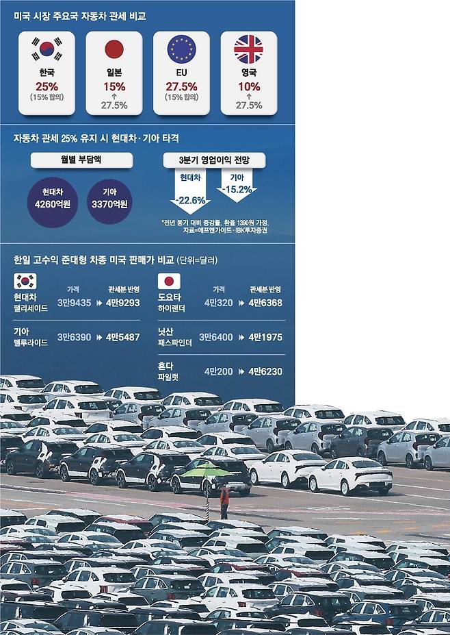 반면 일본과 유럽연합(EU)은 15%의 상대적으로 낮은 관세율을 적용받고 있어 한국 자동차업계의 불공정 경쟁 우려가 커지고 있다. 만약 한국도 15% 관세율을 적용받게 된다면 상황은 크게 달라진다.