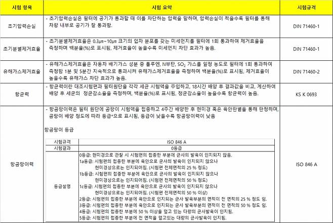차량용 에어컨 필터와 공조 시스템용 필터의 평가 방식은 엄연히 다르다. 공조 시스템용 필터는 미국냉난방공조기술자학회(ASHRAE 52.2)와 유럽(EN1822)의 기준으로 측정된다. 반면 차량용 에어컨 필터는 독일공업규격(DIN 71460-1)을 쓴다.