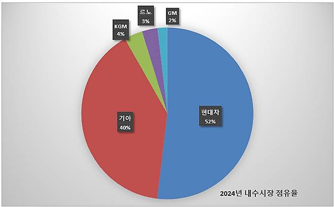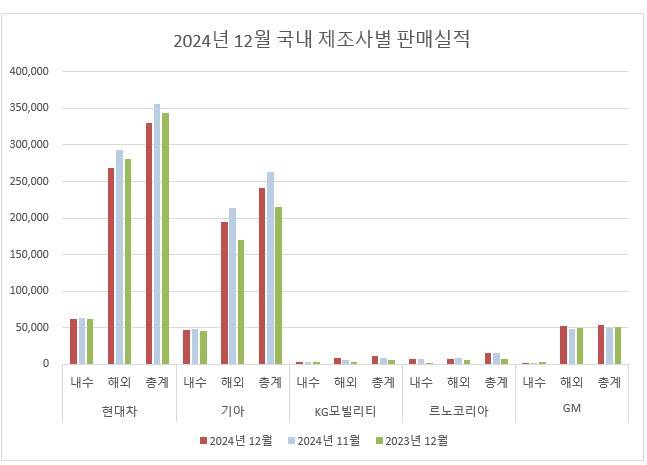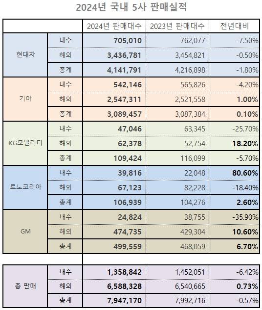 2024년 국내 자동차 시장은 내수 판매량의 급감과 수출 증가라는 대조적인 양상을 보였다. 내수 시장은 경기 부진의 여파로 큰 폭의 역성장을 기록한 반면, 수출은 미국 시장에서의 호조에 힘입어 소폭 증가하는 모습을 나타냈다.