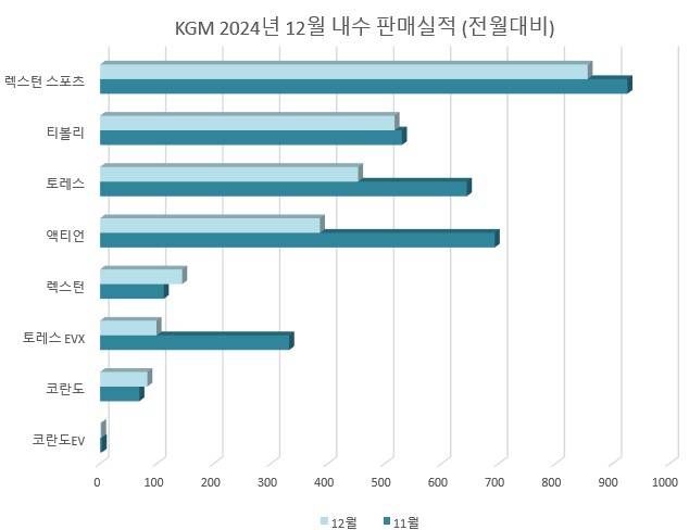 차종별로는 토레스 1,961대, 코란도 1,717대로 각각 전년 동월 대비 215.8%, 140.1% 증가하며 판매 상승세를 이끌었다. 내수 판매는 증가하고 있는 수출 물량 선 대응을 위해 전년 동월 대비 27.6% 감소했다.