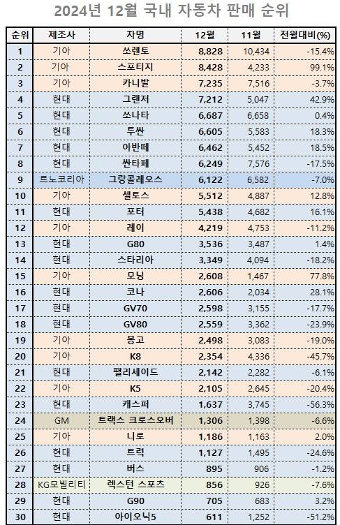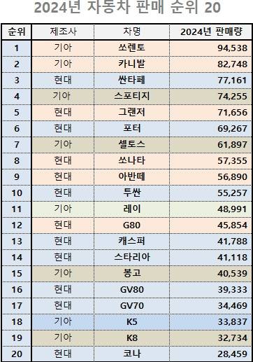2024년 국내 가장 많이 판매된 차량은 '쏘렌토'