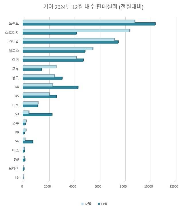 2024년 글로벌 시장에서 가장 많이 판매된 차량은 스포티지로 58만 7,717대가 판매됐으며 셀토스가 31만 2,246대, 쏘렌토가 28만 705대로 뒤를 이었다.
