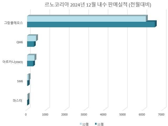 르노코리아는 지난해 12월 내수 7078대, 수출 7569대로 전년 동월 대비 115.2% 증가한 총 1만4647대의 판매 실적을 거두었다. 2024년 연간 판매 대수는 내수 3만9816대, 수출 6만7123대로 총 10만6939대다. 르노코리아의 지난달 내수는 6122대를 판매한 그랑 콜레오스(Grand Koleos)가 실적을 견인하며 전년 같은 달보다 344% 늘어난 7078대의 판매고를 올렸다.