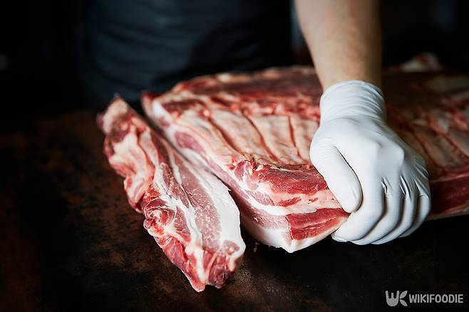 비계 색이 지나치게 창백한 경우도 피해야 한다. 청결 상태도 매우 중요하다. 표면에 이물질이 묻어 있거나 혈액이 말라붙어 있는 고기는 세척이 제대로 되지 않았을 가능성이 크며, 세균 오염의 위험이 있다.
