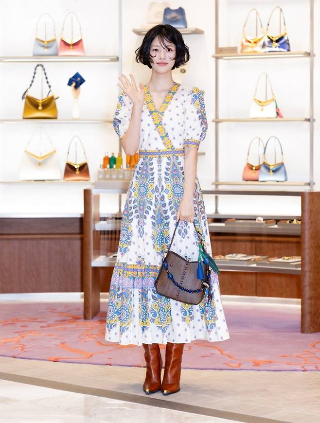 이수경은 페이즐리 모티프 장식의 원피스룩으로 여성스러운 미모를 뽐냈다.