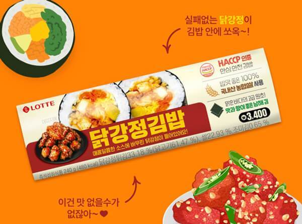 맛있는 것과 맛있는 게 합쳐지면 당연히 맛은 배가되게 된다. 편의점 세븐일레븐이 최근 출시한 제품은 맛있게 즐길 수 있는 닭강정을 김밥과 합친 ‘매콤달콤 닭강정김밥’이다. 매콤달콤한 소스에 버무린 치킨과 케요네즈 양배추 샐러드를 토핑한 김밥 제품이다. 소위 ‘맛없없(맛이 없을 수가 없는)’ 조합이 성공을 거둔 사례로 들 만한 제품이라 할 수 있다. 본 제품의 편의점 판매가는 3,400원이다.