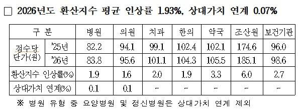내년도 요양기관 유형별 환산지수 인상률은 병원 2.0%, 의원 1.7%, 치과 2.0%, 한의 1.9%, 약국 3.3%, 조산원 6.0%, 보건기관 2.7%로 결정됐다. 이 가운데 병원과 의원에는 상대가치 몫으로 0.1%씩을 더 올렸다.