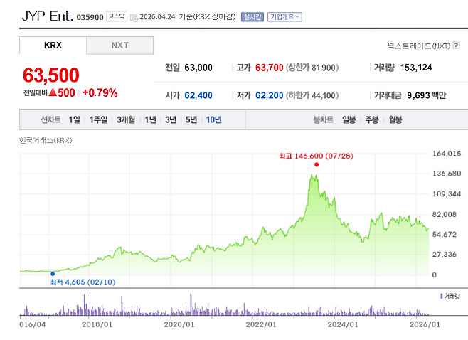 2023년 7월 28일. JYP엔터가 146,600원을 찍었다. 시가총액 5조원을 돌파했다. K-pop 4대 기획사 중 시총 1위에 올라선 적도 있었다.
