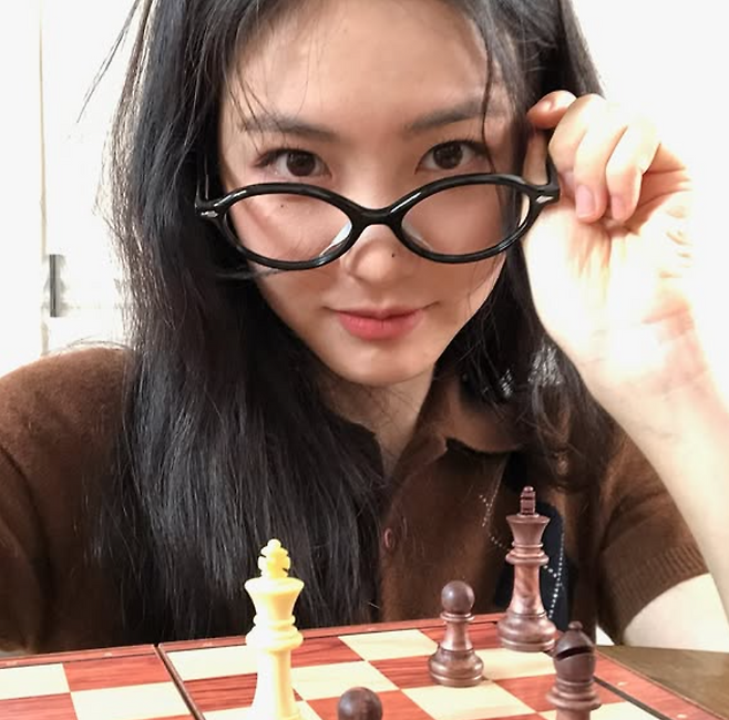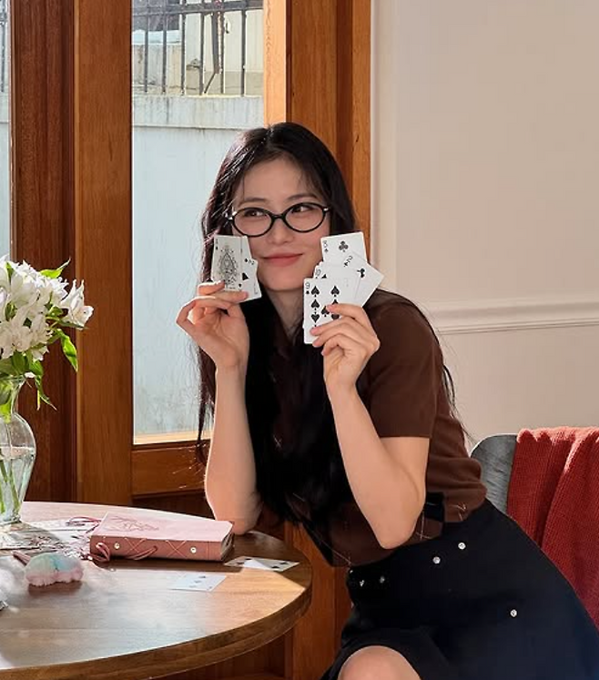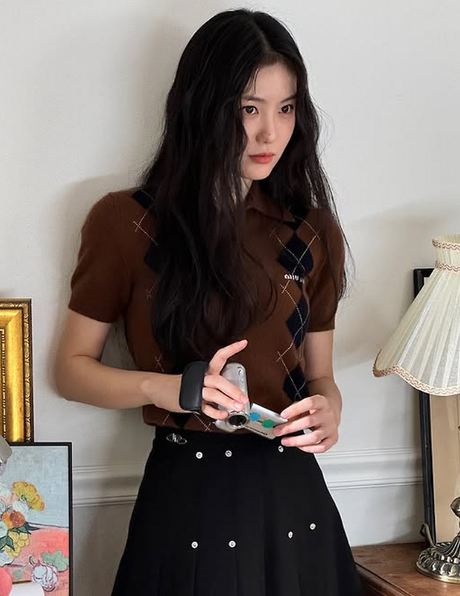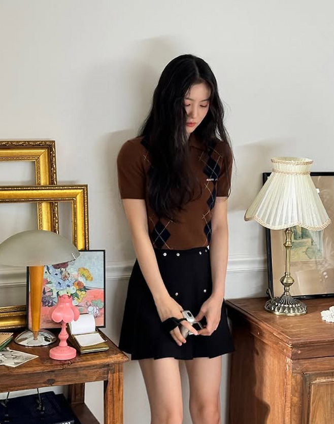 신예은 님은 미우미우 브랜드의 브라운 카라 아가일 니트로 클래식하면서 단정한 분위기를 연출했는데요. 하의는 블랙 플리츠 미니 스커트로 러블리한 분위기가 엿보였죠. 가끔은 동그란 안경태를 착용해서 스타일의 멋을 더하기도 했어요.