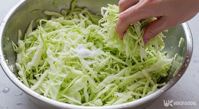 2. 채 썬 양배추에 소금 1T를 넣고 10분간 절인 뒤, 물기를 꽉 짜낸다.