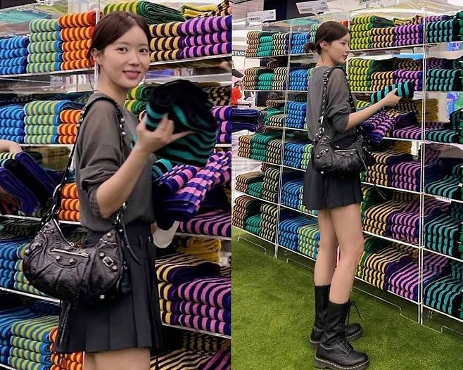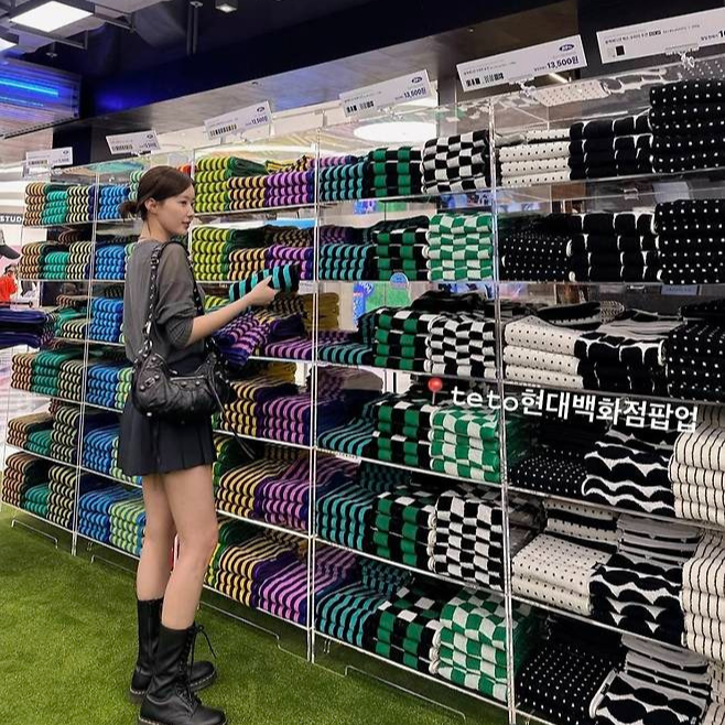 단정하게 묶은 로우번 헤어와 미니멀한 메이크업은 도시적인 세련미를 배가시켰고, 컬러풀한 타월 진열대 앞에서도 독보적인 존재감을 뽐낸 그녀의 룩은 감각적인 믹스매치의 정수를 보여줬습니다.