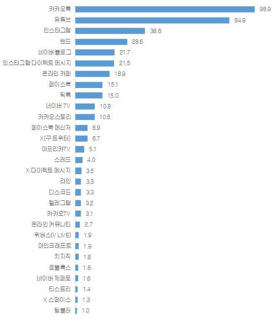 6일 한국언론진흥재단(언론재단)이 보도자료를 통해 공개한 <2024 소셜미디어 이용자 조사> 주요 결과에 따르면 한국 이용자들은 평균 4.25개(제시안 43개)의 소셜미디어를 이용하고 있었다. 이 중 카카오톡이 98.9%, 유튜브가 84.9%의 이용률을 기록, 가장 많이 이용하는 소셜미디어로 조사됐다. 인스타그램(38.6%)과 밴드(28.6%), 네이버 블로그(21.7%)가 큰 격차를 보이며 그 뒤를 이었다. 조사방법과 내용이 달라 직접적인 비교는 어렵지만 언론재단의 과거 조사에서도 카카오톡(2017년 94.7%, 2021년 97.2%)과 유튜브(2017년 70.8%, 2021년 86.5%)는 국내에서 가장 이용률이 높은 소셜미디어로 나타난 바 있다.