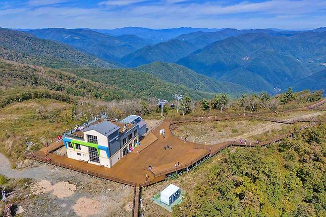 케이블카가 도착하는 상부정류장에는 2,400㎡ 규모의 생태탐방 데크로드가 조성되어 있으며, 정선 시내와 백두대간 능선이 파노라마처럼 펼쳐져 있다. 날씨가 맑은 날에는 멀리 동해의 수평선까지 조망할 수 있을 만큼 시야가 탁 트인다.