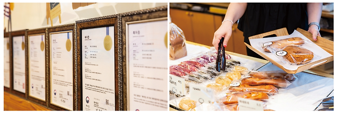 (좌) 가루쌀로 만든 쌀카스텔라로 받은 특허를 비롯해 홍동수 대표가 쌀빵 제조기술로 받은 특허들 (우) 홍윤베이커리에서 판매 중인 다양한 가루쌀빵을 골라 담고 있는 고객. 사진 C영상미디어