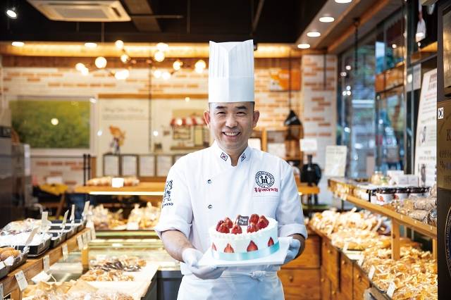 홍윤베이커리 홍동수 대표. 손에 든 딸기생크림케이크는 가루쌀로 만든 제품이다. 사진 C영상미디어