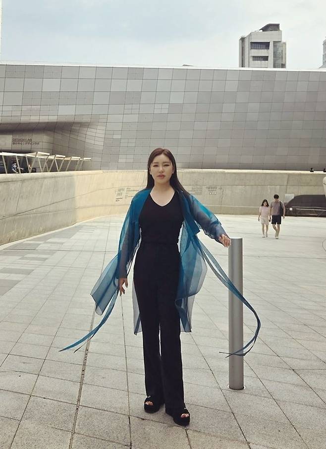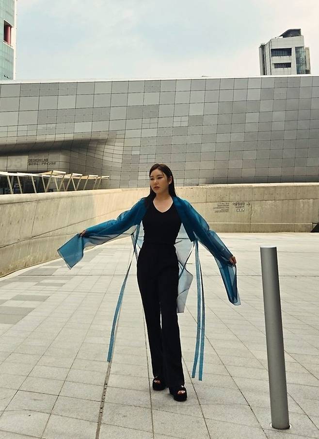공개한 사진에서 송가은은 블랙 팬츠와 블랙 티셔츠에 진한 그린 컬러의 여름 시스루 두루마기 코트를 걸친 스타일로 예쁜 한복 자태를 완성했다.