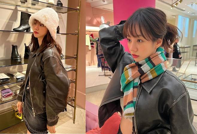 혜리는 블랙 데님 스커트와 블랙 가죽점퍼를 입고 아이보리 퍼 모자와 머플러를 착용해 보며 쇼핑을 즐기는 모습을 공개했습니다. 특히 혜리는 머플러를 고를 때 손으로 올림머리를 만들어 청순한 미모가 더욱 돋보였습니다.