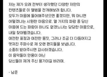 그러면서 RM은 조금 더 자라고 더 늠름해진 주파수로 그간의 제 오랜 편지들을 보낸다면서 소중히 받아주시면 좋겠다고 말하며 “이 음악들이 만용이 아닌 당신들이 제게 주신 용기이길 바라며”라고 글을 마쳤다.