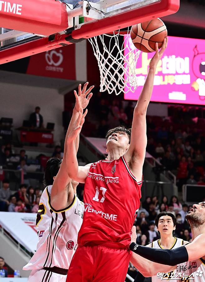 (엑스포츠뉴스 안양, 박지영 기자) 31일 오후 안양실내체육관에서 열린 '2026-2026 LG전자 프로농구' 안양 정관장과 창원 LG의 경기, 정관장 김경원이 슛을 시도하고 있다.