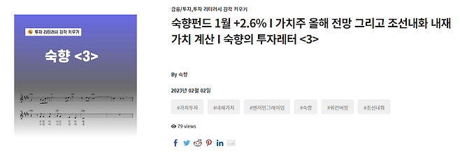 이번에는 숙향펀드 포트폴리오에서 월 단위 수익 성과를 보는 방법, 그리고 숙향 만의 기업 ‘내재가치’ 계산 방법을 자세히 설명하려 합니다. 쉽지만은 않지만 천천히, 하나하나 따라하다보면 숙향의 내공을 느낄 수 있고요. 나만의 종목 선정 방식을 나름대로 체득할 수 있을 것으로 기대해요. 숙향펀드의 2023년 1월 수익율과 이와 관련한 아티클을 보시려면 아래 콘텐츠를 클릭하세요!
