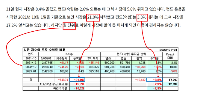 2023년 1월 숙향펀드 성적표(숙향의 투자레터 <3>)를 보면 숙향이 2023년 1월 월간으로 +2.6% 수익률을 올린 것을 알 수 있어요. 2023년 1월의 수익률은 시장 수익률에 미치지 못했죠. 반면 숙향펀드 최초 초기 설정 시점 대비로는 숙향펀드가 시장수익률을 크게 초과하고 있다는 것을 동시에 알 수 있죠.