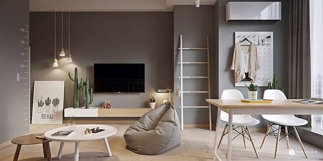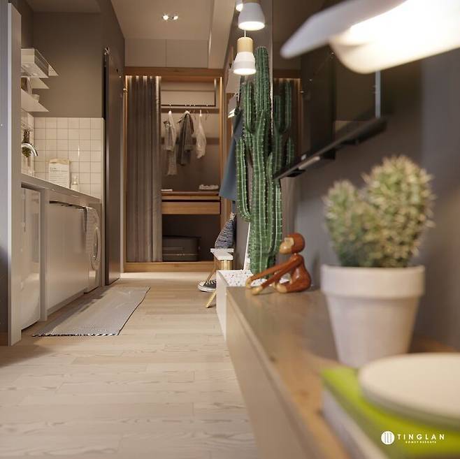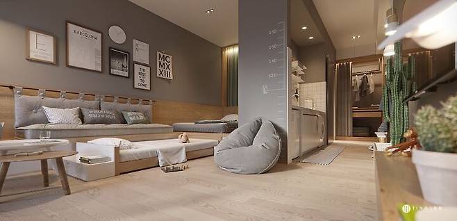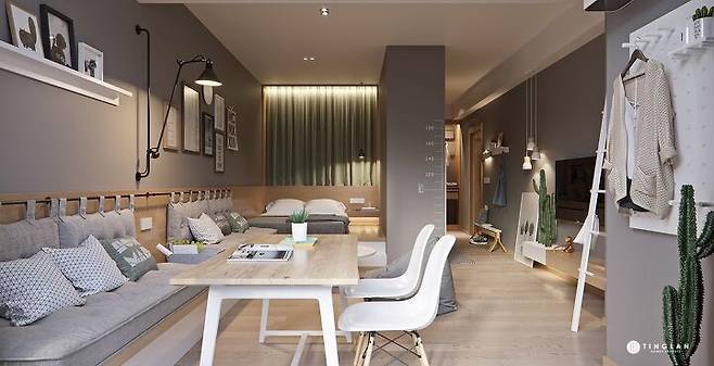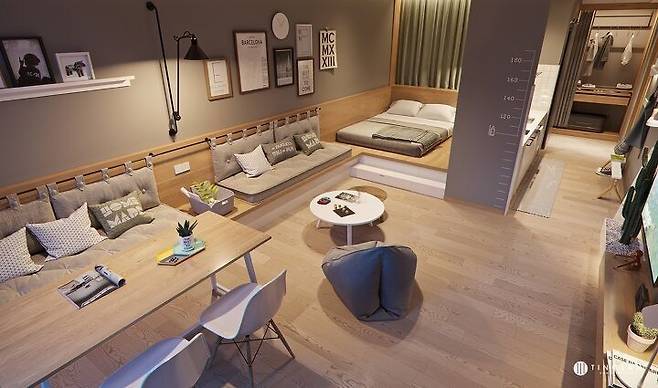 작은 사각의 생활 공간(원룸)을 꼭 동선 없이 난잡하게 사용할 필요는 없다. 또 그런 사각 모양만을 제공하고 사용하는 것이 무의미함을 공급자와 소비자 모두 인지할 필요가 있다. 룸 없이도 가벽 하나만으로도 작은 생활 공간에 재미있는 동선을 만들고, 컬러 통일만으로도 내 스타일로 브랜딩 된 공간에서 멋 부리며 사는 것이 가능하다.