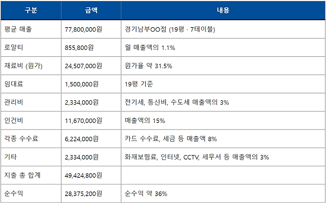 인건비는 월 매출의 15% 비중으로 설정했으며, 로열티는 월 카드 매출의 1.1%가 발생합니다. 또한, 임대료는 19평 기준으로 월 150만 원으로 책정했습니다.