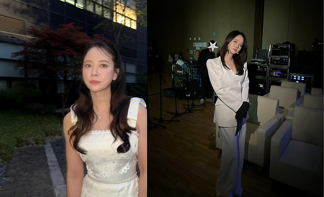 송지효가 깔끔한 화이트 수트로 강렬한 존재감을 드러내고 있다. V넥 디자인의 재킷과 와이드 팬츠로 구성된 이 앙상블은 블랙 장갑과의 대비를 통해 한층 더 세련된 분위기를 자아낸다. 어깨 라인이 강조된 테일러드 재킷은 송지효의 우아한 실루엣을 더욱 돋보이게 하며, 미니멀하면서도 파워풀한 여성상을 표현하고 있다. 백스테이지 세팅과 어우러진 이 화이트 수트 룩은 현대적 엘레강스의 정수를 보여준다.