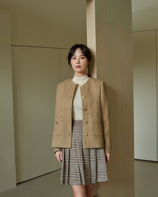 배우 송지효가 베이지 컬러의 트위드 재킷과 체크무늬 스커트를 매치한 룩으로 세련된 가을 패션을 선보이고 있다. 하이넥 화이트 니트와 함께 연출한 이 앙상블은 프렌치 시크 무드를 완벽하게 표현하고 있다. 특히 골드 버튼 디테일이 돋보이는 노칼라 재킷은 클래식함과 현대적 감각을 동시에 갖추고 있으며, 체크 패턴의 플레어 스커트와의 조화가 돋보인다. 송지효는 이 룩을 통해 지적이면서도 여성스러운 이미지를 연출하고 있다.