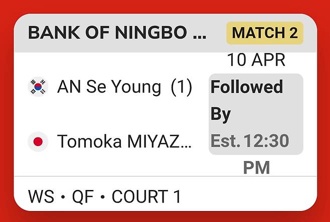 안세영과 미야자키 토모카의 여자 단식 8강전은 10일 1번 코트의 두 번째 경기로 편성됐다. 한국 시간 기준으로 오후 12시 30분경 시작될 예정이며, 앞선 경기 진행 상황에 따라 시간은 유동적으로 변할 수 있다. 이번 대회 전 경기는 ENA와 ENA Sports를 통해 생중계된다.
