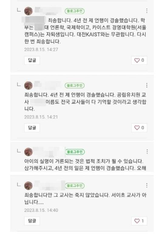 A씨는 블로그에 교사 B씨의 실명을 거론하며 "OOO(B씨 실명) 이름도 전국 교사들이 기억할 것이라 생각한다"며 "죄송합니다만 그 교사는 죽지 않았습니다. 아이의 실명이 거론되는 것은 법적으로 조치될 수 있습니다"는 답글을 달았다.